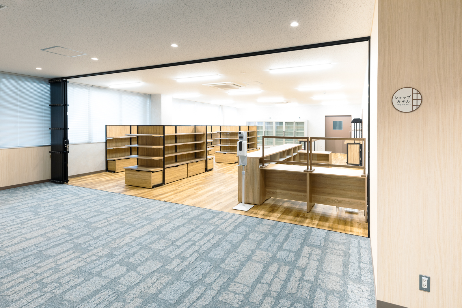 売店:木目什器で暖かい雰囲気に