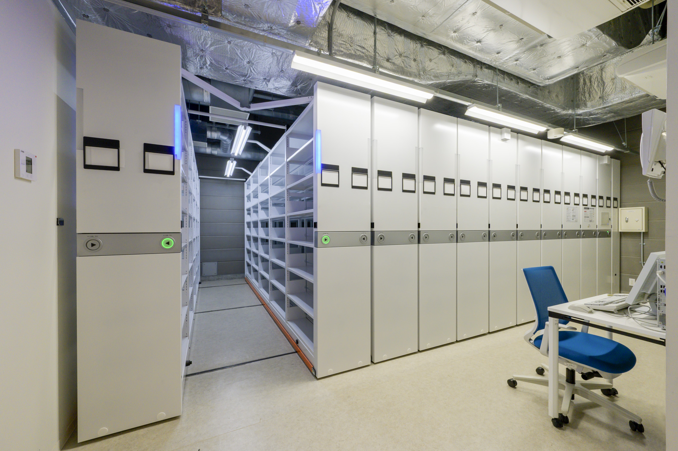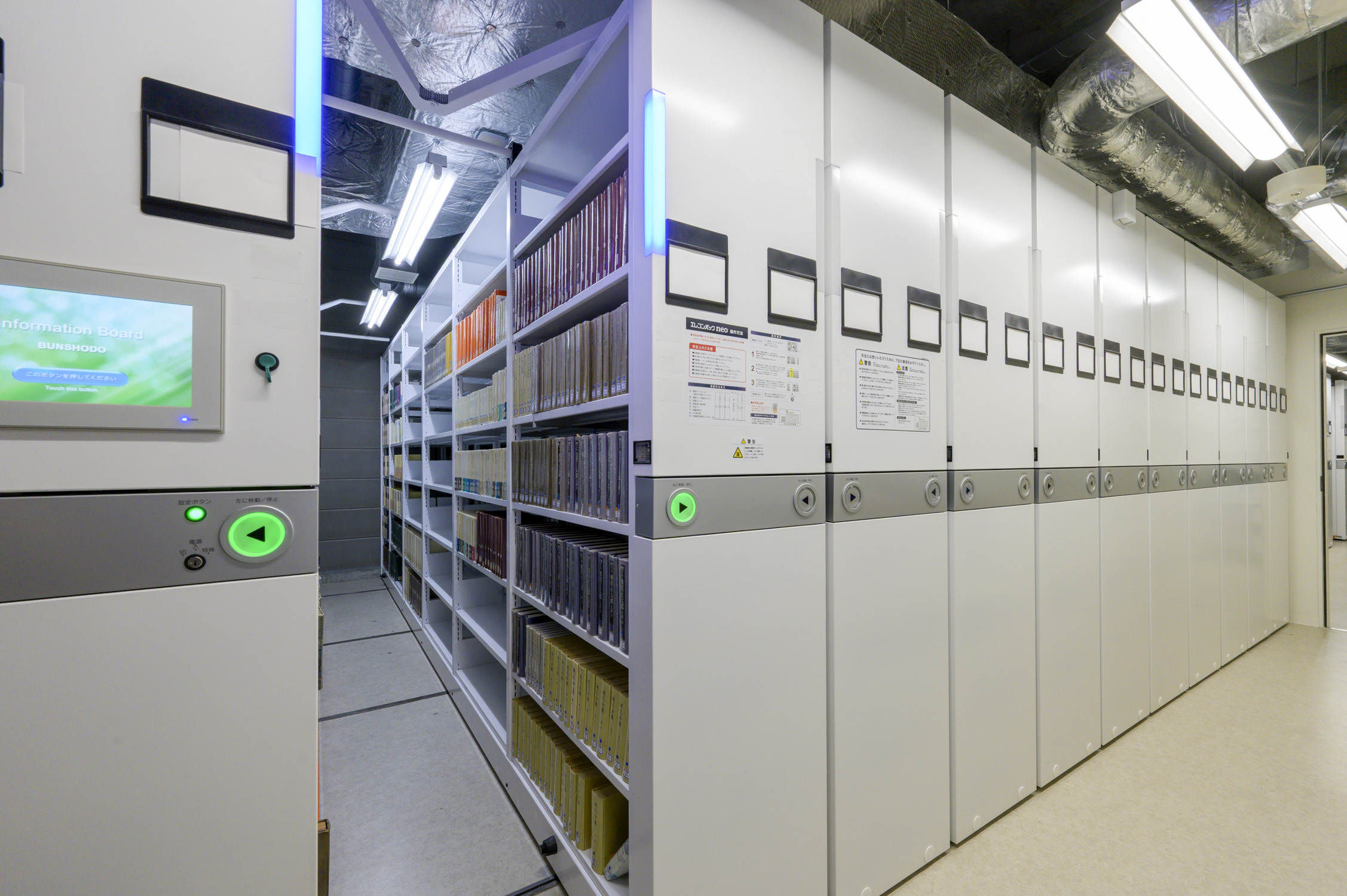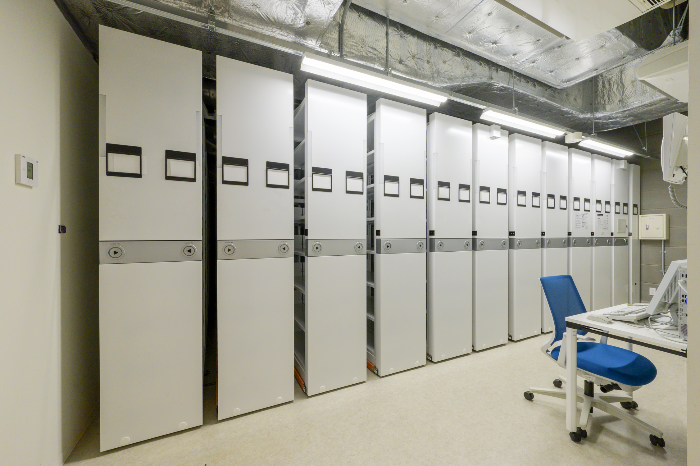地下の書庫スペースを最大限活用し、集密書架を配置することで、収納量を確保しています。